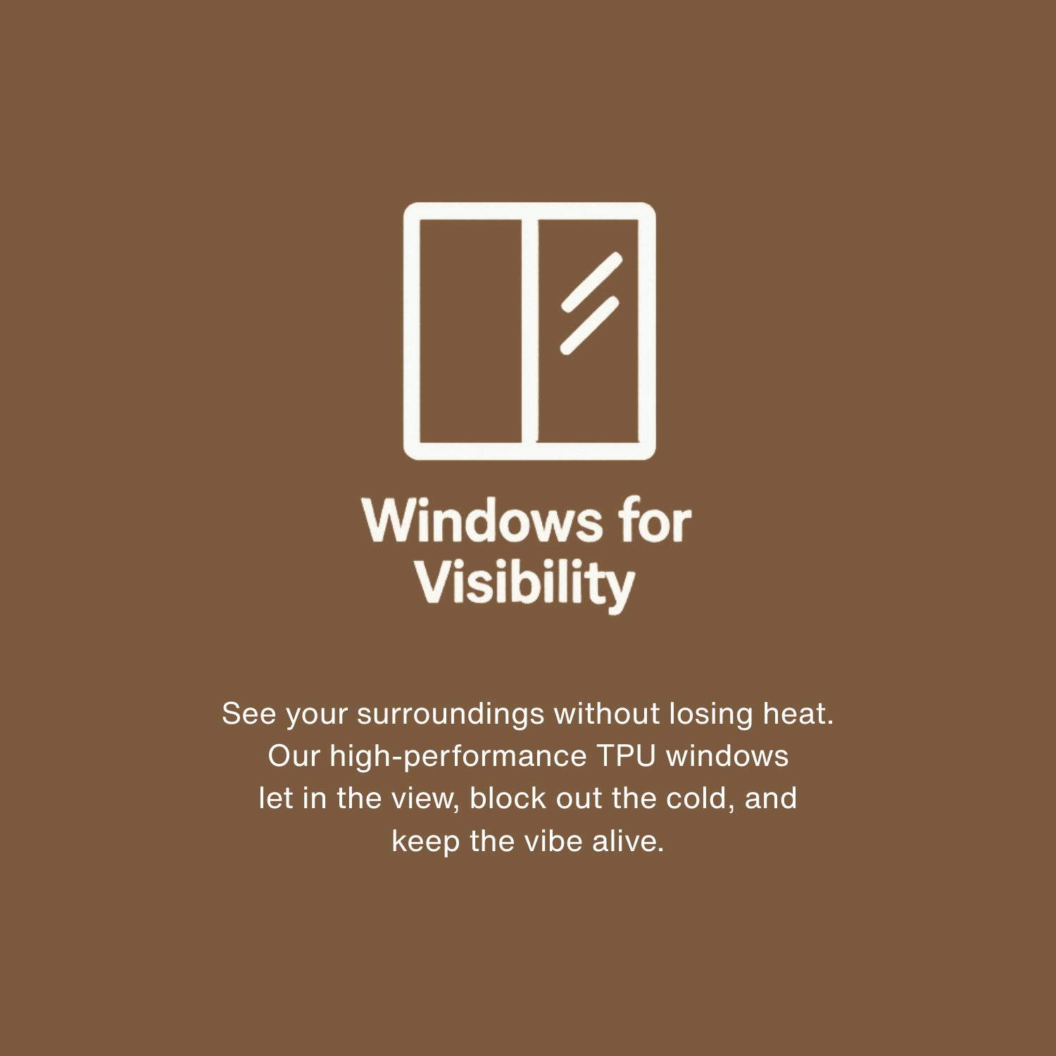 Our tent is designed to handle real adventure, from your backyard to wherever you take it. Made with rugged 300D Oxford fabric and layered for insulation, it keeps the heat in and the weather out. With quality zips, clear TPU windows, and smart ventilation, it’s built for comfort, safety, and visibility. Lightweight, durable, and ready for anything, it’s the kind of setup you’ll want to take everywhere.